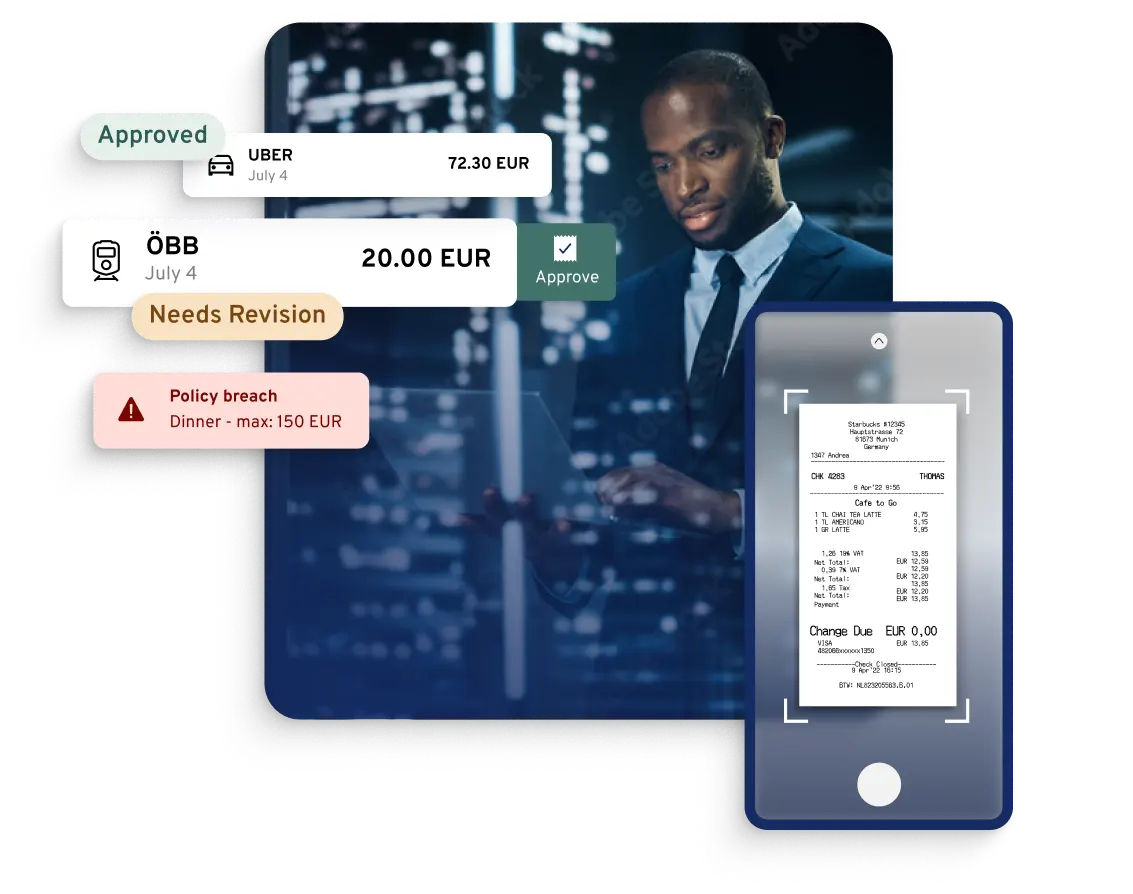 Employees can simply take a picture of the receipt with their mobile app. Once submitted, the AI technology automatically matches it with the corresponding card transaction, significantly reducing the time needed for validating and approving expenses.