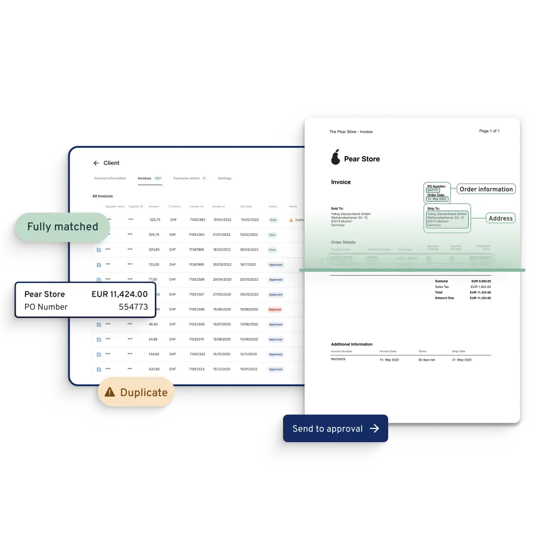 Het matchen van inkooporders omvat het vergelijken van facturen met inkooporders en bonnen, om ervoor te zorgen dat de artikelen overeenkomen en om dubbele betalingen of het betalen voor goederen die niet zijn geleverd, te voorkomen.